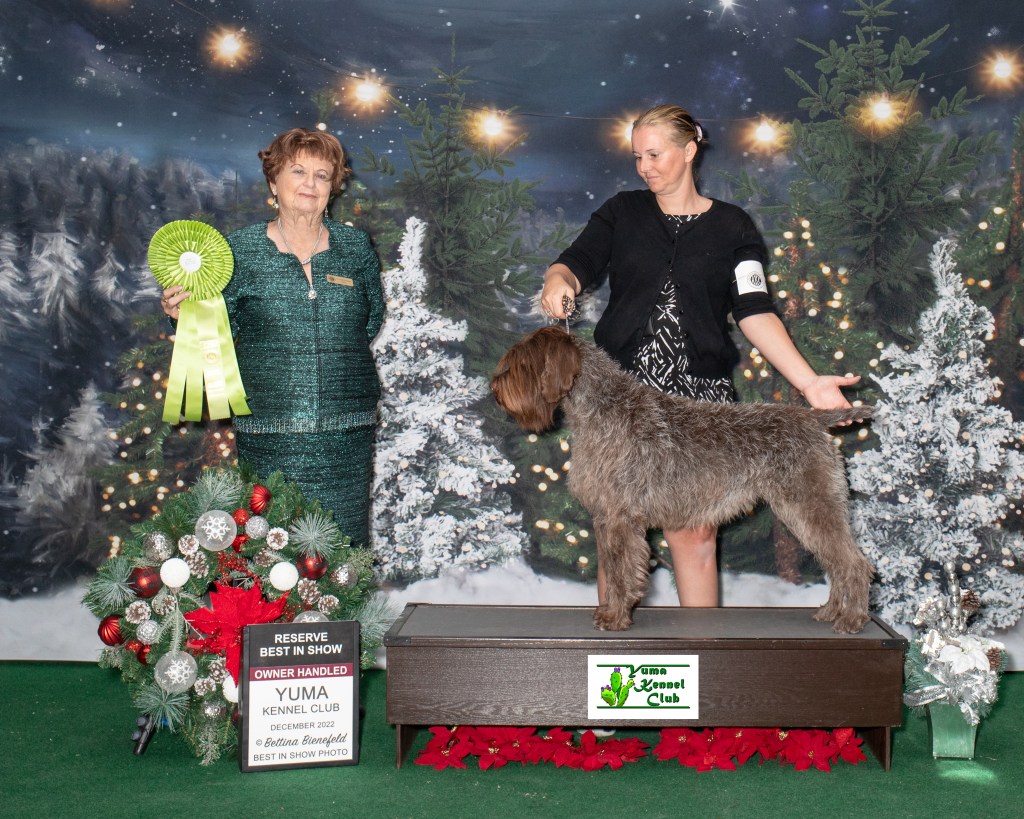 Introducing our little rockstar, Starlight (Star). Star was part of Dazzle’s August 2020 litter. We have some exceptional puppies from this litter. We can’t be more proud of this little girl. She has an amazing calm temperament in the house, but really turns it on in the field. She wants nothing more than to please me and work with me. Star’s favorite past time is finding and pointing birds in the yard but she is also excelling in the show ring. As of the June 2023 Canine Chronical rankings, she is the #2 Owner Handled Griffon and the #2 Female Griffon in breed points. Star has a planned breeding in fall 2023. See our upcoming litters page for more details.